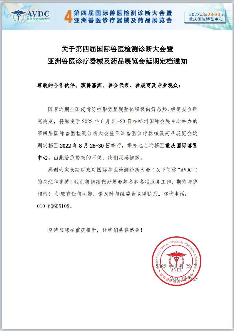 隨著近期全國疫情防控形勢呈現(xiàn)整體積極向好態(tài)勢,經(jīng)組委會研究決定,將原定于2022621-23日在鄭州國際會展中心舉辦的第四屆國際獸醫(yī)檢測診斷大會暨亞洲獸醫(yī)診療器械及藥品展覽會延期定檔至2022828-30舉行,舉辦地點(diǎn)遷移至重慶國際博覽中心。由此給您帶來的不便,我們深感抱歉。