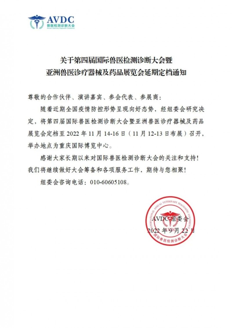 關(guān)于第四屆國(guó)際獸醫(yī)檢測(cè)診斷大會(huì)暨亞洲獸醫(yī)診療器械及藥品展覽會(huì)延期定檔通知