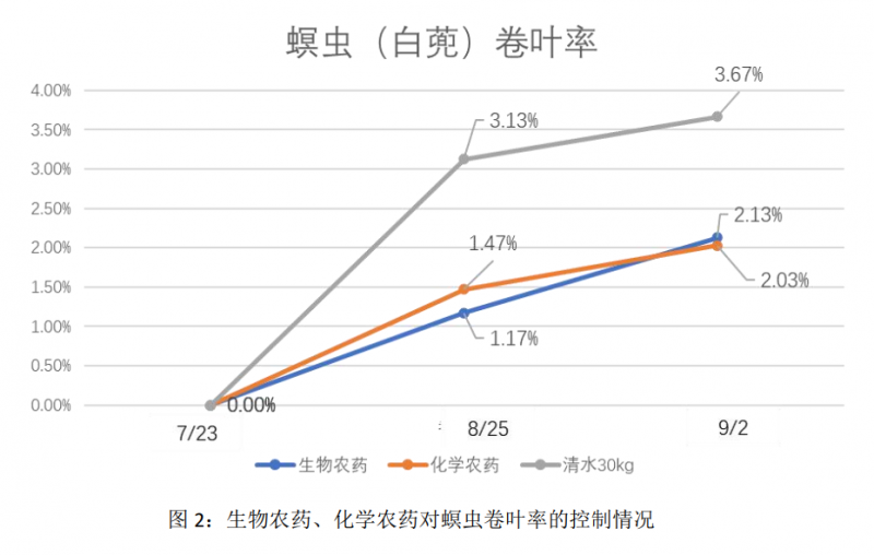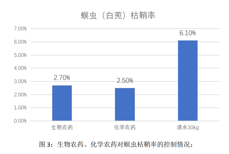 經(jīng)田間蟲情調(diào)查統(tǒng)計, 無論是每次防治產(chǎn)品施入后調(diào)查還是成熟期調(diào)查結(jié)果分析: 處理 A 畝用生物農(nóng)藥制劑 123*100ml 兌水 30kg 均勻噴霧病蟲防治效果