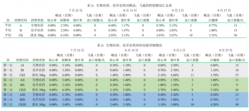 試驗區(qū)域病蟲發(fā)生及田間發(fā)育情況分別于 2022 年 7 月 18 日、2022 年 8 月 10 日、2022 年 8 月 28 日嚴格按試驗方案進行對比試驗相關(guān)處理實施, 每次噴施后第 5天組織技術(shù)人員對蟲害發(fā)生情況進行大田調(diào)查、 并于 9 月 27 日成熟期對蟲害發(fā)情況進行大田調(diào)查統(tǒng)計。