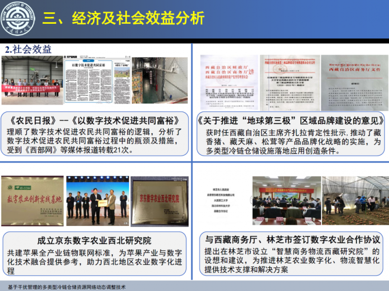 專家組經(jīng)評議認(rèn)為,成果針對生鮮農(nóng)產(chǎn)品多類型冷鏈倉儲資源網(wǎng)絡(luò)動態(tài)調(diào)整難題,采用文獻(xiàn)研究、實(shí)地調(diào)研、運(yùn)籌優(yōu)化以及模擬仿真等方法,建立了平臺模式多目標(biāo)下冷鏈倉儲資源網(wǎng)絡(luò)動態(tài)調(diào)整優(yōu)化框架,構(gòu)建了基于改進(jìn)Box splitting與自適應(yīng)大鄰域搜索的多目標(biāo)優(yōu)化高效求解方法,有利于解決冷鏈倉儲資源網(wǎng)絡(luò)受干擾下的動態(tài)調(diào)整難題,富有創(chuàng)新性,具有重要的學(xué)術(shù)價(jià)值與應(yīng)用價(jià)值。成果研發(fā)的基于干擾管理的多類型冷鏈倉儲資源網(wǎng)絡(luò)動態(tài)調(diào)整系統(tǒng),通過嵌入村鎮(zhèn)社區(qū)物流數(shù)據(jù)共享與集成平臺,在陜西、黑龍江等多家涉農(nóng)企業(yè)開展了示范應(yīng)用,為解決村鎮(zhèn)農(nóng)產(chǎn)品多類型冷鏈倉儲資源網(wǎng)動態(tài)調(diào)整難題提供了新方法和新技術(shù),經(jīng)濟(jì)和社會效益較顯著。成果面向我國村鎮(zhèn)多類型冷鏈倉儲資源網(wǎng)絡(luò)動態(tài)調(diào)整實(shí)際需求,實(shí)現(xiàn)了多種冷鏈倉儲資源的高效配置與動態(tài)調(diào)整,化解了有干擾、多目標(biāo)情形下冷鏈倉儲資源的動態(tài)調(diào)整難題,有利于促進(jìn)我國多類型冷鏈倉儲資源社會化服務(wù)平臺模式的建立,對于提高村鎮(zhèn)冷鏈倉儲運(yùn)營管理水平和降低冷鏈倉儲基礎(chǔ)設(shè)施運(yùn)營成本具有較大的應(yīng)用價(jià)值和推廣前景。該成果總體達(dá)到國內(nèi)先進(jìn)水平。