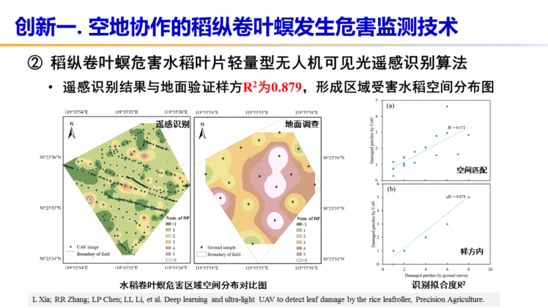 專家組經評議認為,成果針對當前水稻施藥防控決策與病蟲害災變信息不匹配、不對稱問題,提出了大數(shù)據(jù)驅動的病蟲害防治綜合處方生成技術,將定量遙感、物聯(lián)網(wǎng)、無線通信、導航定位等先進技術應用于植保無人機水稻病蟲害防控生產中,提出了空地協(xié)作的稻縱卷葉螟發(fā)生危害監(jiān)測技術,研制了大數(shù)據(jù)驅動的病蟲害防治綜合處方決策系統(tǒng),研發(fā)了農資農技植保無人機飛防作業(yè)智能管理系統(tǒng),形成了互聯(lián)網(wǎng)+的“病蟲害信息智能獲取—綜合處方決策—無人機精準噴施”的智能化解決方案,在水稻病蟲害精準防控上實現(xiàn)重要創(chuàng)新。該項技術的應用,為科學施藥防治提供了指導依據(jù),改變了以人工現(xiàn)場調查、主觀經驗判斷是否打藥的經驗式植保方式,提升了水稻植保作業(yè)的智能化、信息化水平。該項技術在實際應用過程中操作簡便、可靠性高,減少了人力物力投入、提高了防治效率,對按需施藥防治提供了智能技術手段。成果處于國內領先水平,技術熟化程度高,經濟社會成效顯著。