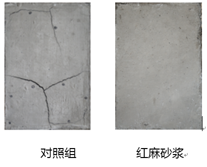 (五)提質(zhì)增效情況:本技術(shù)中,紅麻秸稈經(jīng)簡(jiǎn)單粉碎即可實(shí)現(xiàn)全稈利用,秸稈添加量可達(dá)到6 wt%~12 wt%。大量添加紅麻秸稈的砂漿具有優(yōu)異的抗裂性能(圖2),且具有滿(mǎn)足施工要求的機(jī)械性能,其中抗壓強(qiáng)度和抗折強(qiáng)度分別大于10 MPa和5 MPa,且砂漿密度低于1200 kg/m3,導(dǎo)熱系數(shù)低于0.4 W/m·K,真正實(shí)現(xiàn)了輕質(zhì)抗裂保溫的效果。