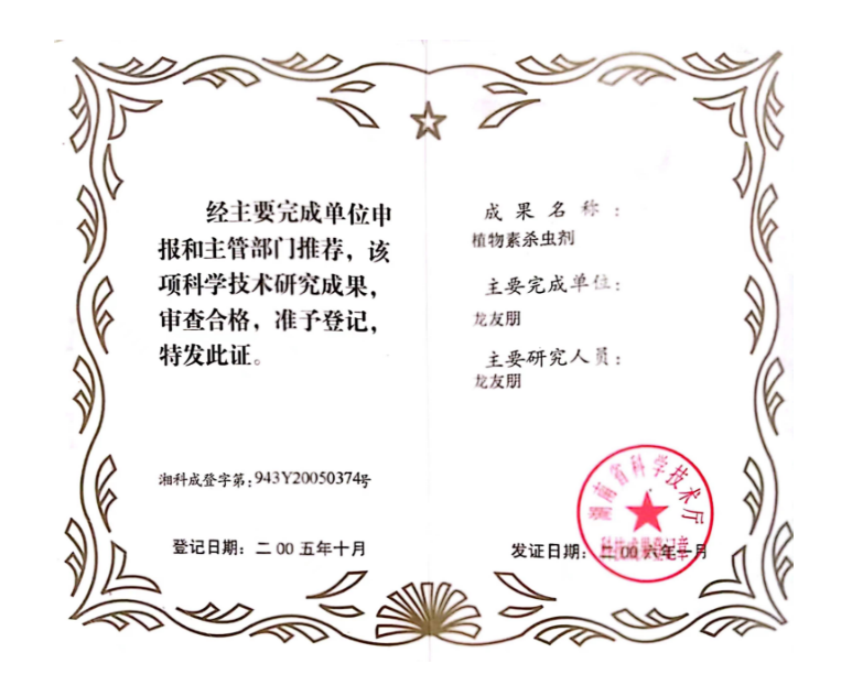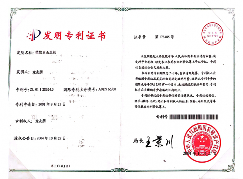實(shí)施例5,本發(fā)明是通過(guò)將苦楝素、苦參堿、臭椿汁、洋金花按下列重量比配制而成:(略)它通過(guò)以植物原料提煉的組份復(fù)配而成,對(duì)人畜無(wú)害,也不會(huì)對(duì)環(huán)境造成污染,它可在使用時(shí)根據(jù)需要兌水,可用于防治菜青蟲(chóng)、小菜蛾、菜螟、蚜蟲(chóng)、斜紋夜蛾、茶葉毛蟲(chóng)、菜蟻、稻飛虱、稻卷螟、鉆心蟲(chóng)等病蟲(chóng)害。
