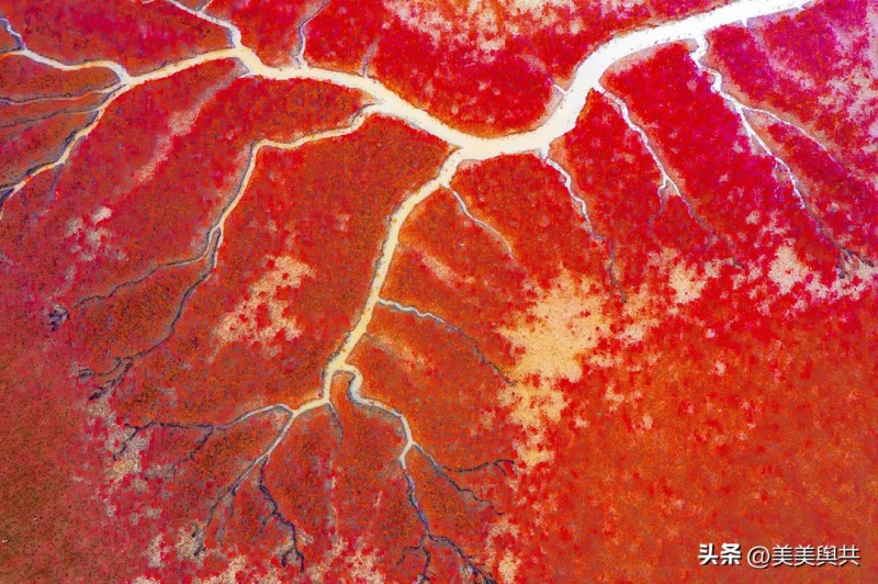 紅海灘是一種叫作堿蓬草的植物大規(guī)模生長(zhǎng)形成的,堿蓬草喜歡生長(zhǎng)在鹽堿性的土壤當(dāng)中,這是一種在海邊常見(jiàn)的草類(lèi),通常只有20-60cm,看上去枝體纖細(xì),而且還有多級(jí)的枝杈,最顯著的特點(diǎn)就是對(duì)生的葉線形上有著紅色條紋。