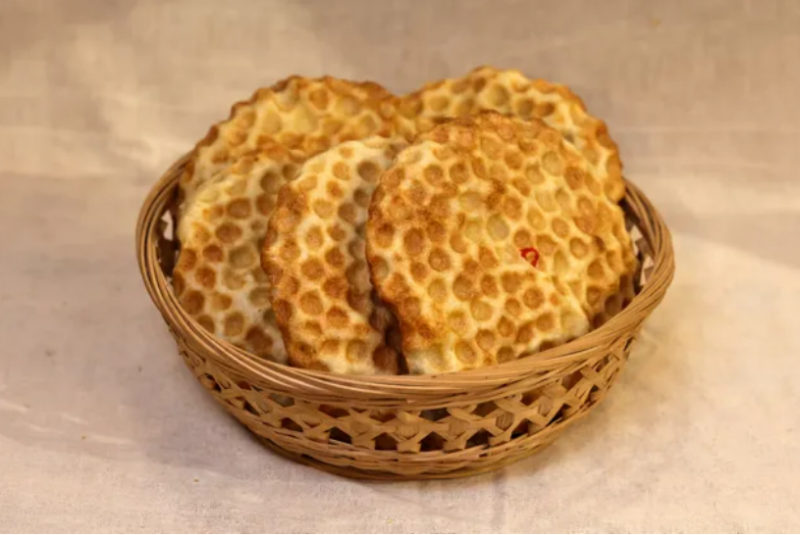 烙制是最后一關(guān),鐵鏊子燒至冒煙,用油擦一遍鏊面(防粘增香),鋪上面餅后,用竹刷蘸水輕掃表面,水汽蒸騰讓面餅鼓起小泡;隨即撒上預(yù)熱的鵝卵石,蓋蓋燜一會兒,翻面再壓片刻,火候要像“老人抽煙袋”般穩(wěn)定,“太旺易焦,太弱不酥”。出鍋時餅身金黃帶焦斑,輕輕一掰有“咔嚓”脆響,內(nèi)里卻帶微濕的韌勁,才算“火候到家”。這些步驟需長期練習(xí)才能熟練,每一步都藏著對美食的用心。